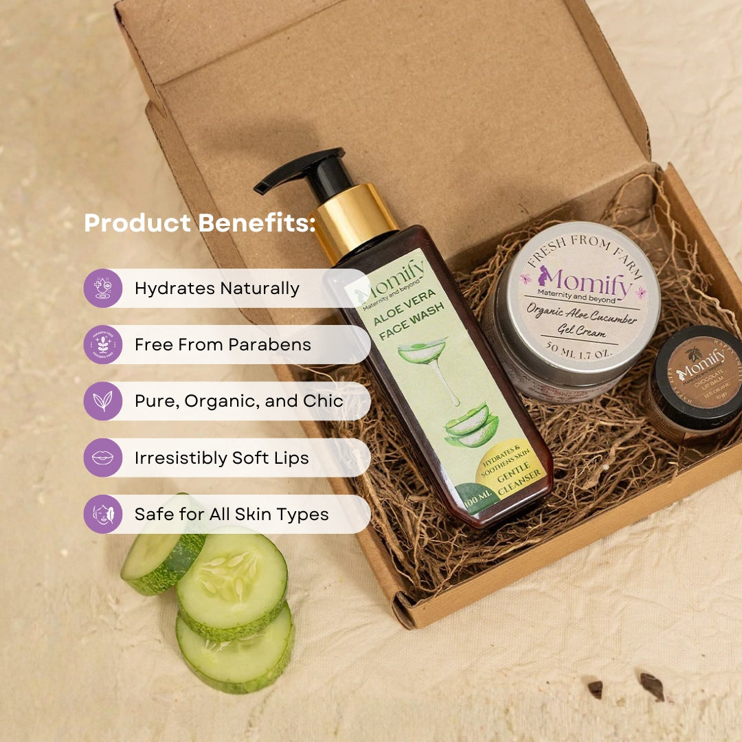Meet the Momify GlowKiss Hydration Trio — your everyday skincare essential, curated fresh from organic farms. This luxe set brings together the detoxifying purity of Aloe Vera Face Wash, the soothing hydration of Aloe Vera Moisturizing Gel, and the antioxidant indulgence of Chocolate Lip Balm. 💧🍫